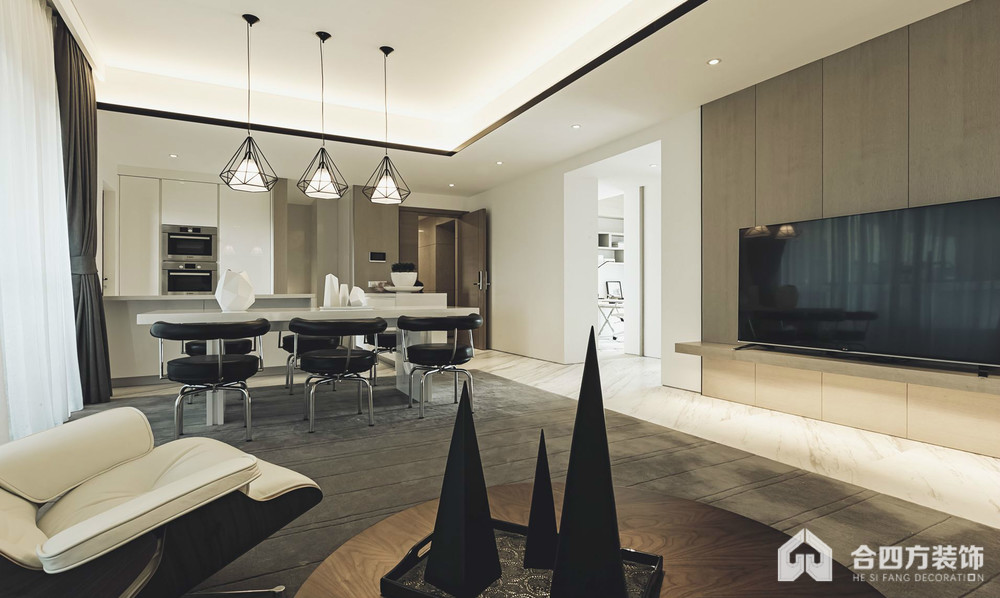 案例说明:现代简约风格不推崇繁杂的装饰,饰品的使用并不多,但每一个都别具一格,而且造型、线条简单,却极具个性化。