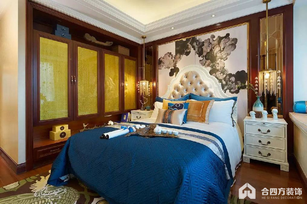 案例说明:主人房色调迷情、富有层次,奢华品纹样图案融合欧式创作元素相得益彰,报春花艳丽的金黄欢快的跃动着。在光影中传递着美好的感性体验,奢享空间独具华贵气质。